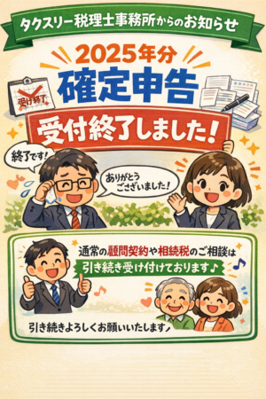 申し訳ございませんが、2025年分の所得税確定申告につきましては、受付を終了いたしました。来年以降のご相談や通常の顧問契約、相続税につきましては、引き続き受け付けしておりますので、お問い合わせくださいませ。